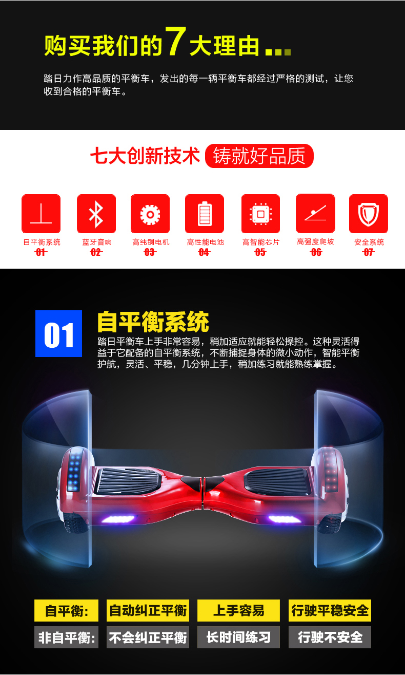 这款 TR 踏日 两轮体感儿童成人 双轮平衡车,采用全新自平衡二代系统,专为儿童设计,灵活平稳,上手轻松。先进蓝牙功能,可以连接各种智能设备,500W全铜电机,25KM超长续航,12KM/h时速,持久续航锂电池,断电保护、稳压保护、过热保护和绝缘保护。智能电子平衡芯片,自如操控,均衡保护,最高可以走30度爬坡。